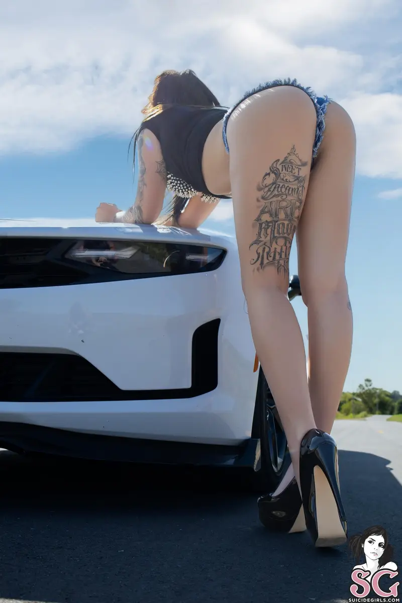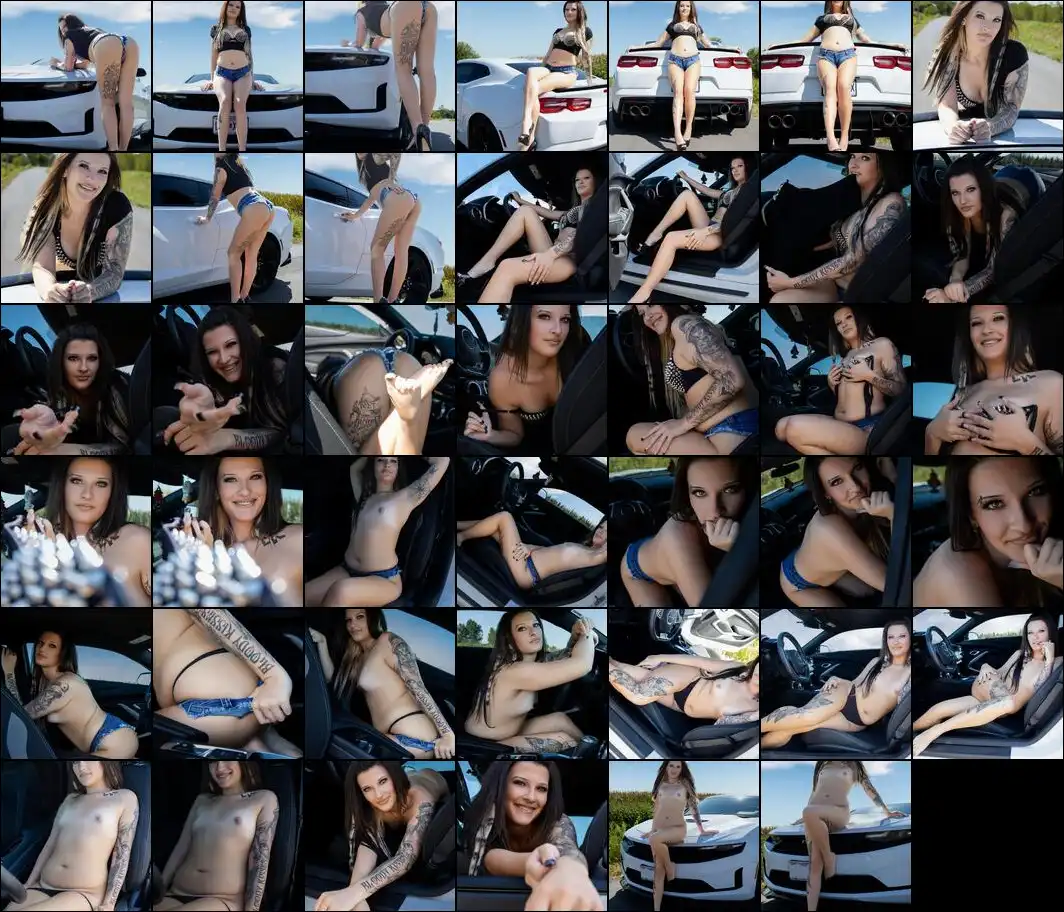 Buckle up, because this set isn't slowing down for anyone. With a white Camaro as her backdrop and curves that rival the bodywork, she takes you on a ride fueled by speed, seduction, and just the right amount of danger. This is more than horsepower...it's pure lust at full throttle, and she's in complete control of the wheel.rayvenblood