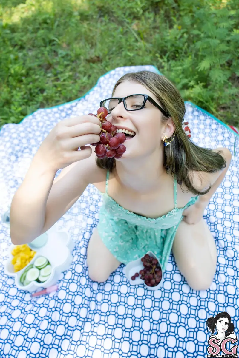Laid out on a soft blanket under the sun, fruit scattered around, she turns an innocent picnic into something far more dangerous. Sweet pineapple, ripe grapes, and lips just as juicy. This set proves that temptation doesn’t always come in the form of forbidden fruit. She’s playful, teasing, and oh so berry tempting… do you dare take a bite?vixenryder